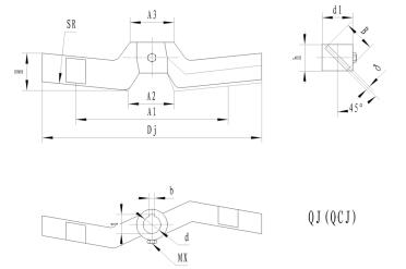 | DJ | d | h | 螺栓d0 | 銷軸d1 | d2 | b | t | N/n不大于 | δ | 重量(kg) |