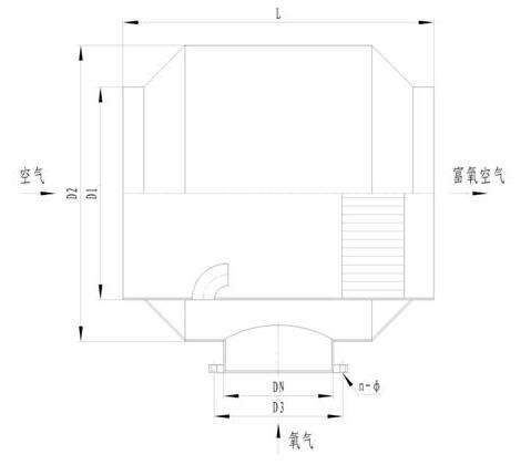 本產品由內、外筒體,導流筒和混合單元組成(見下圖)。氧氣進入兩筒體之間的空間后經導流筒引入空氣流中實現初混,然后進入混合單元,被多次切割分流,從管尾出來的已經是均勻混合的富氧空氣。